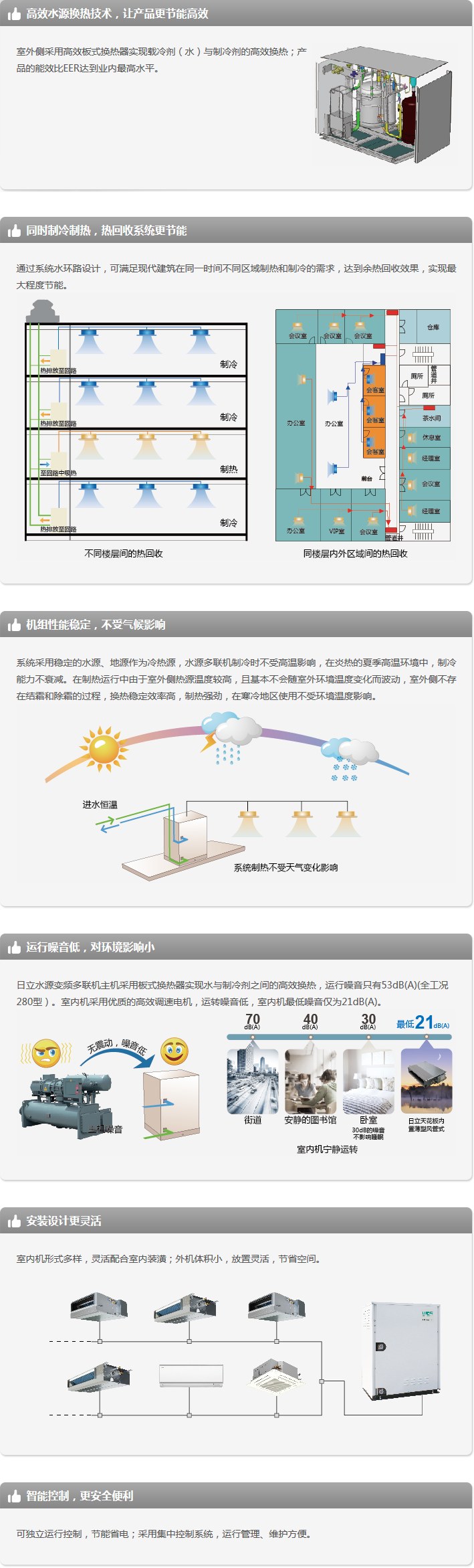 日立水源变频多联机成功将水源热泵技术、多联机控制技术、直流变频驱动技术和R410A环保工质等结合在一起,糅合了风冷多联式变频空调和水冷式冷水机组机组两大类产品的技术优点——既有多联机的变负荷处理的灵活、部分负荷能效比高、配置自由多变的特点,又有水地源热泵机组的高能效、运行平稳的优点,通过高效板式换热器和中间介质循环水,利用海洋、土壤、工业废热、城市污水等低品位热源中的热能进行制冷供暖,极大地节约了能源。日立水源多联机分为常规型水源多联机和全工况水源多联机。